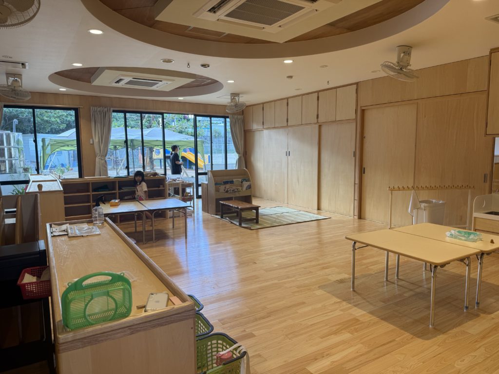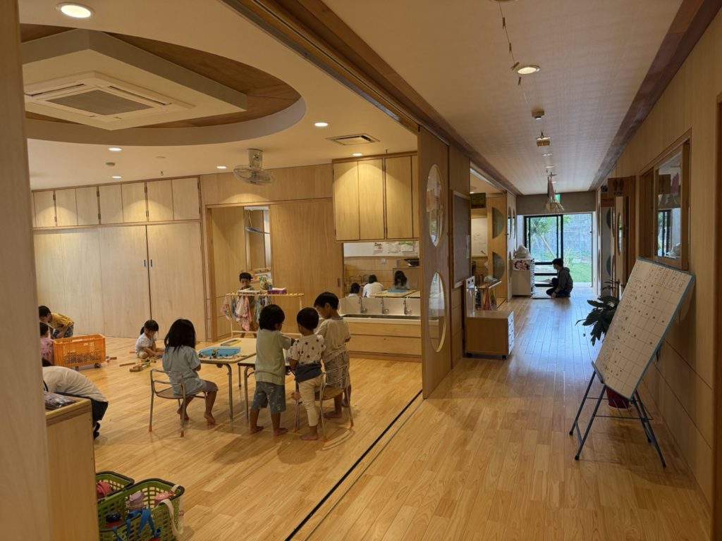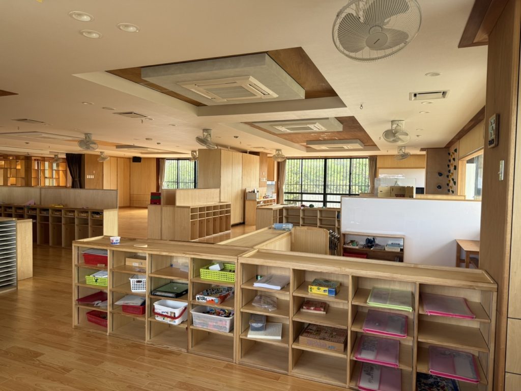 2Fの保育室は写真の通り、壁等がない一面に広いスペースになっています。広いスペースにした理由としては法的な制限もございますが、それ以上に様々な理由で先が見えないこの時代(よくVUCAと示されます)に、空間を流動的に使えるようにしたかったからです。