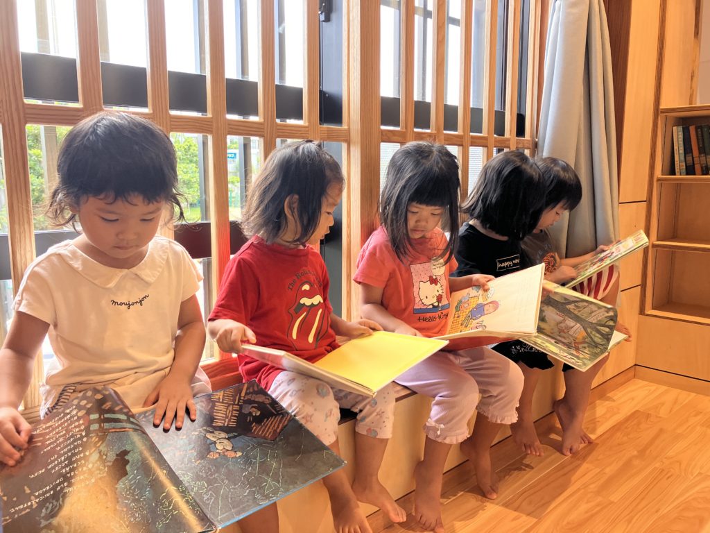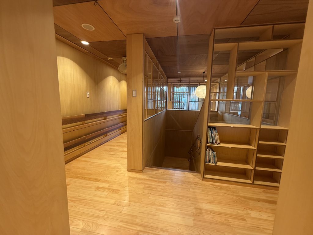 階段を上がると絵本コーナーが広がっています。絵本がまだまだ格納できるスペースがありますので、階段をぐるりと囲むようなスペースに子どもたちの好きな絵本、手にとって欲しいなと感じる古典の絵本などがずらっと並べられる日を楽しみにしています。コーナーの奥には子どもたちが落ち着いて絵本を読むことができるベンチもしつらえて頂きました。