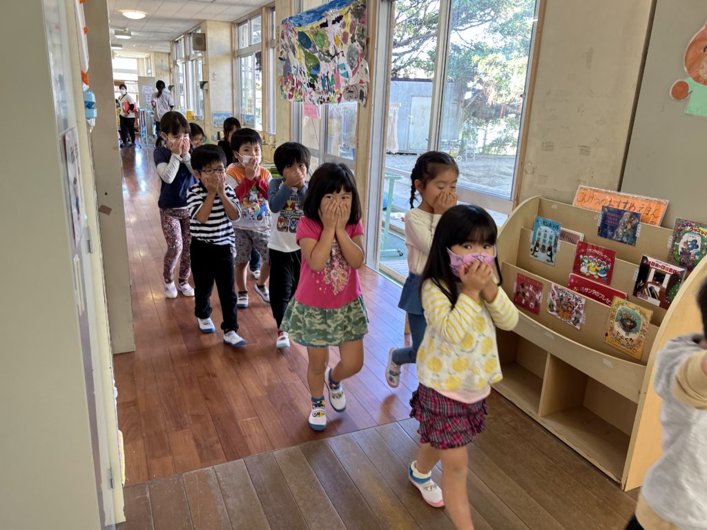 子どもたちの避難の様子です。進級・入園当初は不安な子どもたちもいましたが、余裕を感じながら、しかし真剣に避難する子どもたち。遊びはもちろん万が一の有事の際もしっかりと子どもたちを支えられるようにこれからも過ごしていきたいと思います。