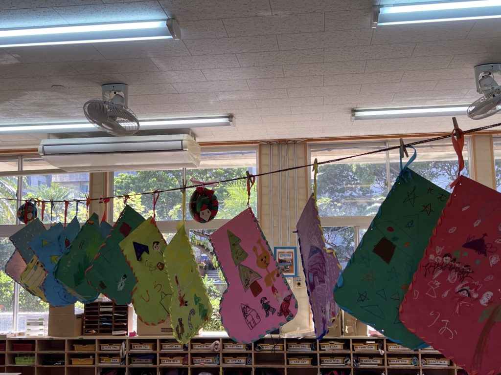 前回は動物との背くらべが楽しめた玄関の柱も、新しいツリースペースに変身しました。「誰が作ったの!?」「すごい!」とわくわくする子どもたち。さて来週に子どもたちの作品で埋まっていくのが楽しみです。